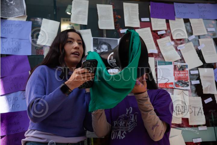 CIUDAD DE MÉXICO, 28OCTUBRE2025.- Activistas y escritoras realizaron un mitin poético frente a la librería del Fondo de Cultura Económica, bloqueando la entrada y colocando fotografías de autoras mexicanas, en protesta por las declaraciones de Paco Ignacio Taibo II sobre la literatura escrita por mujeres. FOTO: ANDREA MURCIA / CUARTOSCURO.COM