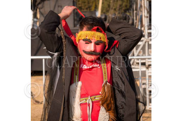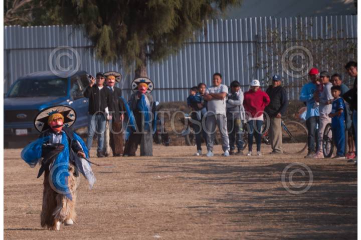 ZACATELCO, TLAXCALA, 28ENERO2026.- La Feria de Zacatelco 2026 incluyó la primera Carrera de Chivarrudos, un evento en el que participaron adultos y niños vestidos con el traje tradicional de chivarrudo. El chivarrudo es un personaje del carnaval de Zacatelco que representa a los antiguos caporales de las haciendas. Se caracteriza por el uso de chivarras (pantalones de piel de chivo), máscaras de madera y un caballito de madera colocado en la cintura, así como por realizar bailes y recitar versos durante las festividades del sur de Tlaxcala. FOTO: ALAÍN HERNÁNDEZ/CUARTOSCURO.COM
