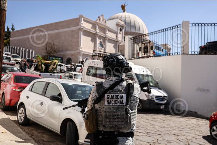 ZACATECAS, ZACATECAS, 25FEBRERO2026.- Elementos de Guardia Nacional custodian las instalaciones funerarias en dónde se vela el cuerpo de Nahomi Elizabeth Martínez, elemento de GN perdió la vida en cumplimiento de su deber durante un operativo para la captura de Nemesio Oceguera, el pasado domingo en Tapalpa. La joven zacatecana de 22 años estuvo en la primera línea y fue de los elementos caídos en el operativo. Su cuerpo permanecerá este día y mañana será sepultado por sus familiares. FOTO: ADOLFO VLADIMIR /CUARTOSCURO.COM