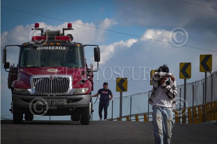 TIJUANA BAJA CALIFORNIA 26NOVIEMBRE2025.- Un incendio consumió por completo dos viviendas de madera ubicadas en una ladera de la colonia Libertad, sobre las calles Apolo y 16. La columna de humo fue visible desde varias zonas de la ciudad, mientras bomberos acudieron con dos máquinas extintoras, dos tanques y un equipo de 10 elementos para evitar la propagación del fuego. Aunque vecinos intentaron controlarlo en los primeros minutos, las estructuras quedaron en pérdida total. No se reportaron personas lesionadas. FOTOS CHRIS NOYOLA / CUARTOSCURO.COM