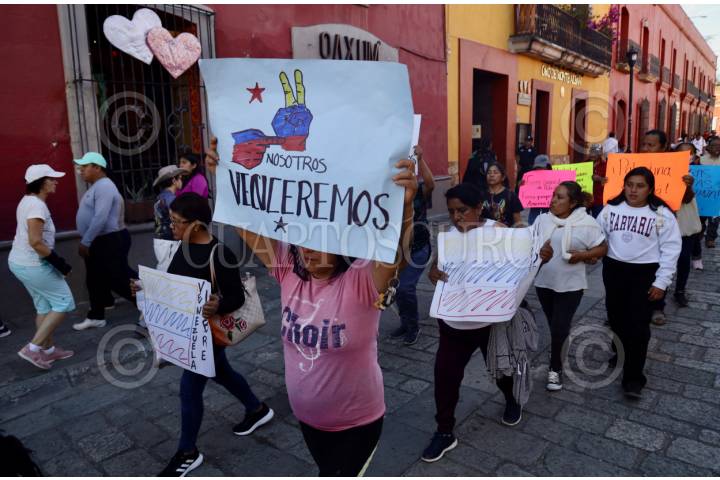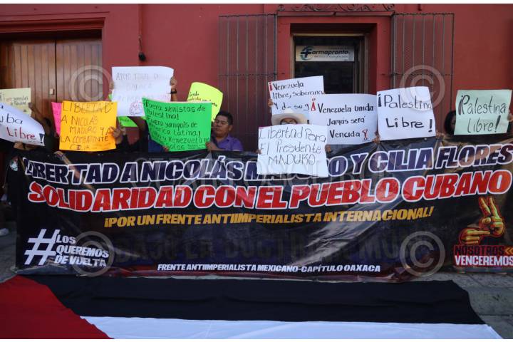 OAXACA DE JUÁREZ, OAXACA, 07FEBRERO2025.- Integrantes de la Promotora del Frente Antiimperialista Mexicano Capítulo Oaxaca (PFAM-CO), iniciaron una manifestación para refrendar su solidaridad con Venezuela, exigir la libertad del presidente Nicolás Maduro y la diputada Cilia Flores, y rechazar la invasión de Estados Unidos en países latinoamericanos. Los manifestantes marcharon sobre el andador turístico hacia el zócalo de la ciudad de Oaxaca. FOTO: CAROLINA JIMÉNEZ MARISCAL/CUARTOSCURO.COM