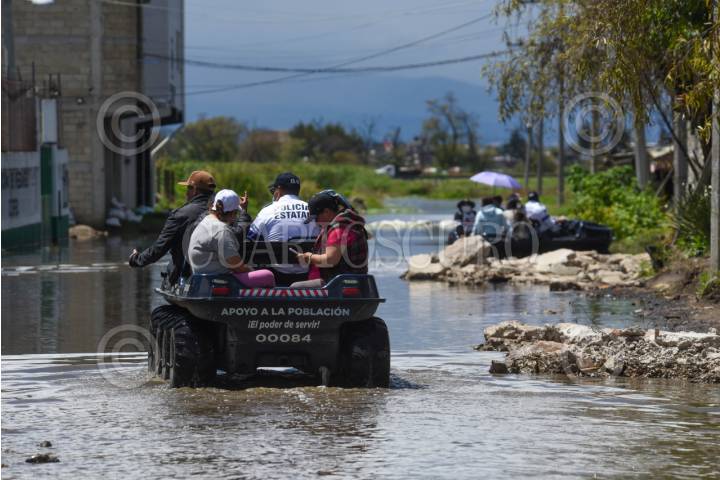 LERMA, ESTADO DE MÉXICO, 25SEPTIEMBRE2025.- Habitantes de San Pedro Tultepec que viven en las calles 30 de Abril, Del Carril y Trinidad Padilla se transportan en vehículos anfibios de la Secretaría de Seguridad Estatal ya que llevan más de 20 días inundados, se han instalado costales de arena para que puedan salir las personas de sus casas y accedan a talleres en donde se trabajan muebles de madera, ir a la escuela y trabajos, así como buscar sus alimentos. Piden a las autoridades municipales y estatales tomar cartas en el asunto, ya que han empezado a enfermarse por esta problemática. FOTO: CRISANTA ESPINOSA AGUILAR/CUARTOSCURO.COM