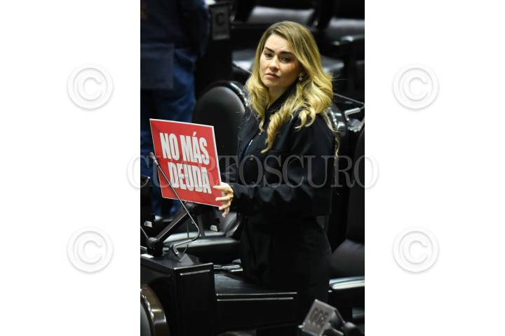 CIUDAD DE MÉXICO, 24SEPTIEMBRE2025.- Ariana del Rocío Rejón, diputada del PRI, muestra una cartulina con la frase "No más deuda" durante la comparecencia de Edgar Amador Zamora, secretario de Hacienda y Crédito Público, ante el pleno de la Cámara de Diputados con motivo del análisis del primer informe de gobierno federal y la presentación de propuestas de ingresos, egresos y políticas fiscales para el 2026. FOTO: MARIO JASSO/CUARTOSCURO.COM