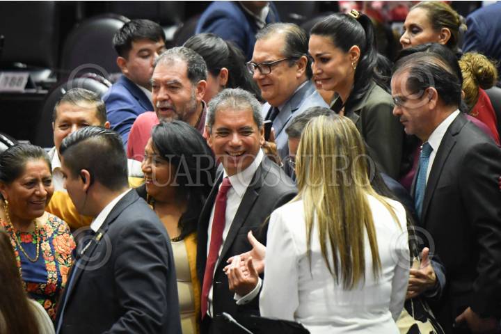 CIUDAD DE MÉXICO, 23SEPTIEMBRE2025.- Edgar Amador Zamora, secretario de Hacienda y Crédito Público, durante su llegada a la comparecencia ante el pleno de la Cámara de Diputados con motivo del análisis del primer informe de gobierno federal y la presentación de propuestas de ingresos, egresos y políticas fiscales para el 2026. La acompañan Kenia López Rabadán, presidenta de la mesa directiva, y los legisladores Sergio Gutiérrez Luna; Sergio Mayer; Paulina Rubio Fernández y Raúl Bolaños-Cacho. FOTO: MARIO JASSO/CUARTOSCURO.COM