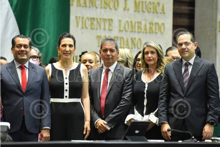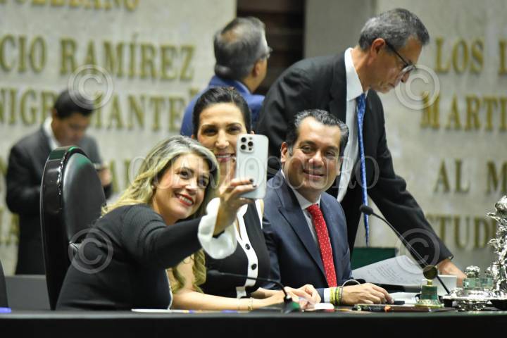 CIUDAD DE MÉXICO, 24SEPTIEMBRE2025.- Kenia López Rabadán, presidenta de la mesa directiva junto a los vicepresidentes Paulina Rubio Fernández y Sergio Gutiérrez Luna, se toman una fotografía durante la sesión en la que compareció Edgar Amador Zamora, secretario de Hacienda y Crédito Público, ante el pleno de la Cámara de Diputados con motivo del análisis del primer informe de gobierno federal y la presentación de propuestas de ingresos, egresos y políticas fiscales para el 2026. FOTO: MARIO JASSO/CUARTOSCURO.COM