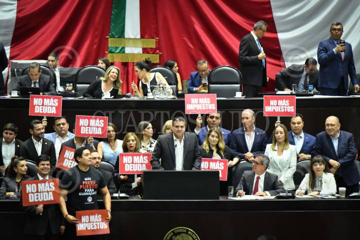 CIUDAD DE MÉXICO, 24SEPTIEMBRE2025.- Legisladores panistas colocaron en sus curules cartulinas para manifestarse en contra de la situación económica actual del país, durante la comparecencia de Edgar Amador Zamora, secretario de Hacienda y Crédito Público, ante el pleno de la Cámara de Diputados con motivo del análisis del primer informe de gobierno federal y la presentación de propuestas de ingresos, egresos y políticas fiscales para el 2026. FOTO: MARIO JASSO/CUARTOSCURO.COM