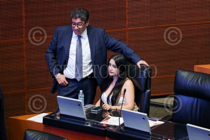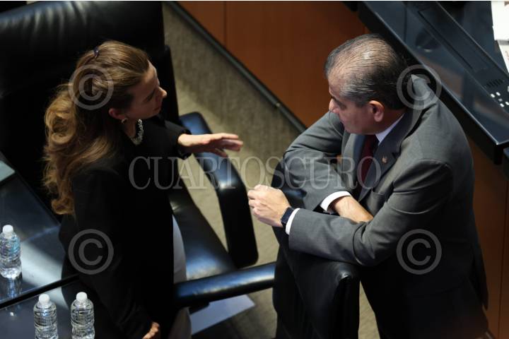 CIUDAD DE MÉXICO, 09DICIEMBRE2025.- la senadora Carolina Viggiano conversa con el senador Miguel Riquelme, ambos del PRI, durante la penúltima sesión del 2025 del Senado de la República, en la que se aprobó el 10 de abril cómo el Día Nacional del Huapango. FOTO: GALO CAÑAS/CUARTOSCURO.COM