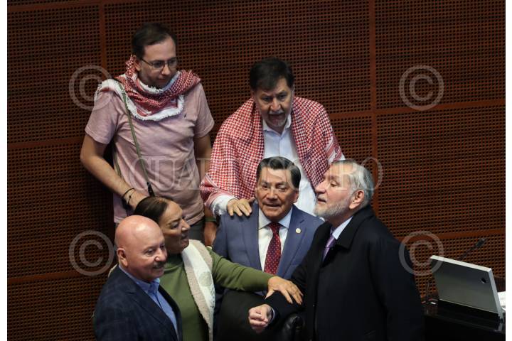 CIUDAD DE MÉXICO, 09DICIEMBRE2025.- Los senadores morenistas Lucía Trasviña; Gerardo Fernández Noroña; Óscar Cantón Zetina y el coordinador Adán Augusto López durante la penúltima sesión del 2025 del Senado de la República, en la que se aprobó el 10 de abril cómo el Día Nacional del Huapango. FOTO: GALO CAÑAS/CUARTOSCURO.COM