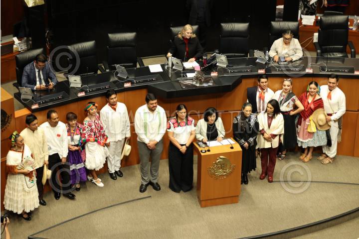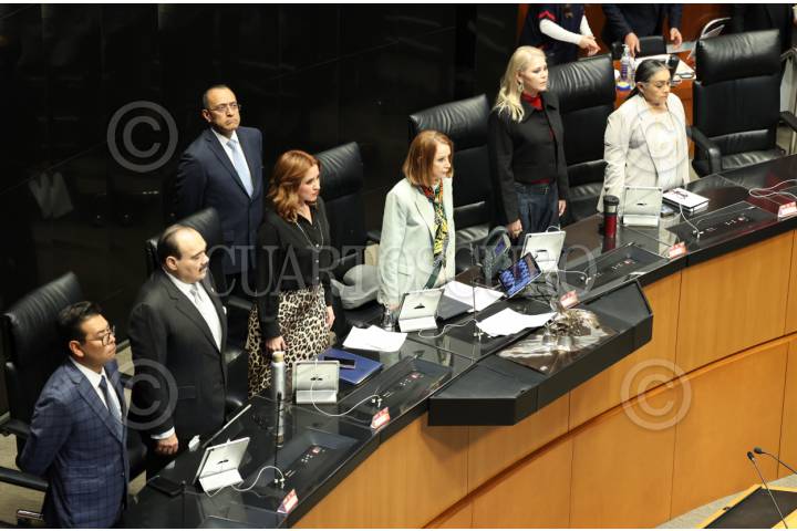 CIUDAD DE MÉXICO, 09DICIEMBRE2025.- Minuto de silencio por parte de la mesa directiva por el fallecimiento de Miguel Ángel Chico Herrera (secretario técnico de la JUCOPO) durante la penúltima sesión del 2025 del Senado de la República, en la que se aprobó el 10 de abril cómo el Día Nacional del Huapango. FOTO: GALO CAÑAS/CUARTOSCURO.COM