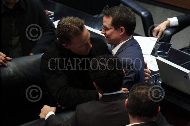 CIUDAD DE MÉXICO, 09DICIEMBRE2025.- Manuel Velasco Coello, coordinador del PVEM, abraza a Ricardo Anaya, coordinador panista, durante la penúltima sesión del 2025 del Senado de la República, en la que se aprobó el 10 de abril cómo el Día Nacional del Huapango. FOTO: GALO CAÑAS/CUARTOSCURO.COM