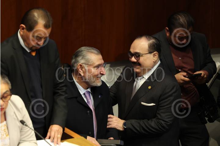 CIUDAD DE MÉXICO, 09DICIEMBRE2025.- El Adán Augusto López, coordinador de Morena, y el senador del PVEM, Carlos Ramírez Marín, conversaron durante la penúltima sesión del 2025 del Senado de la República, en la que se aprobó el 10 de abril cómo el Día Nacional del Huapango. FOTO: GALO CAÑAS/CUARTOSCURO.COM