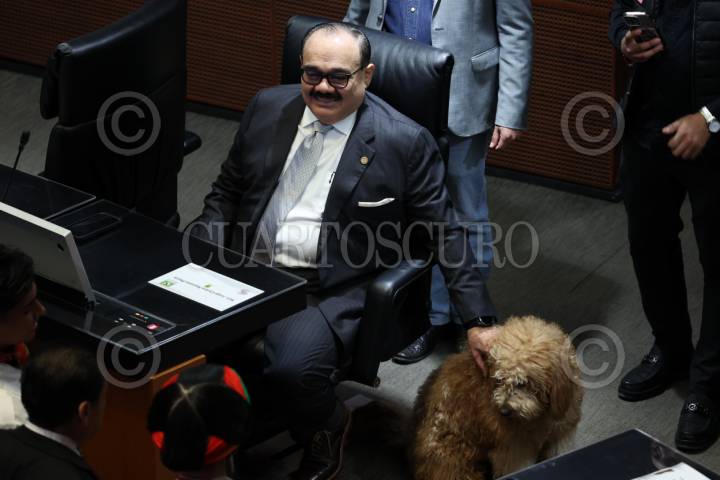 CIUDAD DE MÉXICO, 09DICIEMBRE2025.- El senador del PVEM, Carlos Ramírez Marín, acudió con su mascota a la penúltima sesión del 2025 del Senado de la República, en la que se aprobó el 10 de abril cómo el Día Nacional del Huapango. FOTO: GALO CAÑAS/CUARTOSCURO.COM