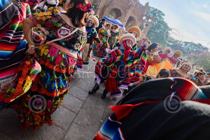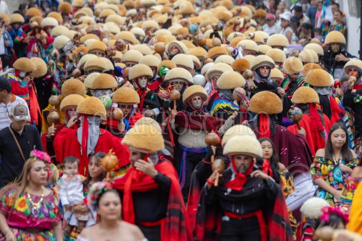 HUEJOTZINGO, PUEBLA, 16FEBRERO2026.- Participantes ataviados con coloridos trajes y máscaras recorren las calles durante el Carnaval de Huejotzingo, celebración anual previa a la Cuaresma que combina danzas tradicionales, dramatizaciones de batallas históricas, uso de pólvora y música popular, atrayendo a miles de habitantes y visitantes que preservan y viven la identidad local. FOTO: MIREYA NOVO/CUARTOSCURO.COM