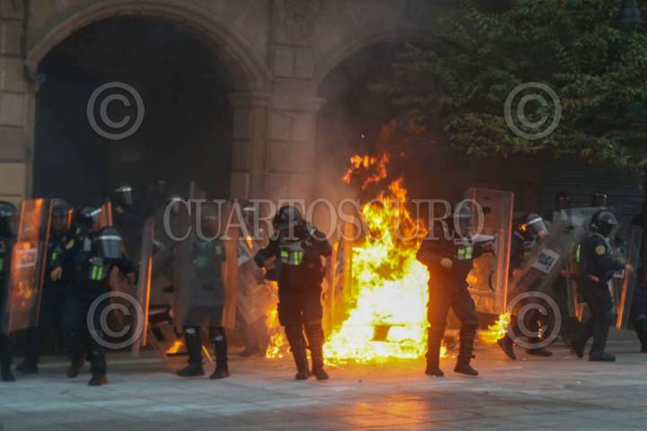 CIUDAD DE MÉXICO, 02OCTUBRE2025.- Jóvenes encapuchados, identificados como de la agrupación del Bloque Negro, se enfrentaron a elementos de la Secretaría de Seguridad Ciudadana, en las inmediaciones del Zócalo, durante la marcha conmemorativa de la Matanza Estudiantil de 1968, en Tlatelolco. Los embozados atacaron con piedras, palos, cadenas, bombas molotov, y petardo a los uniformados, quienes los intentaron repeler con extintores. Muchos de los policías fueron despojados de sus escudos y otros más fueron golpeados. El saldo fue de varios heridos de ambos lados que fueros atendidos por miembros del ERUM. FOTO: GRACIELA LÓPEZ HERRERA/CUARTOSCURO.COM