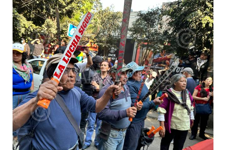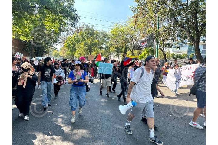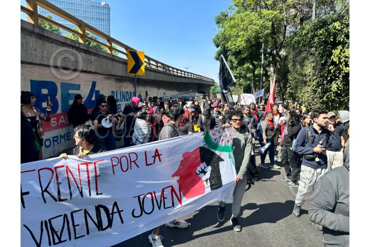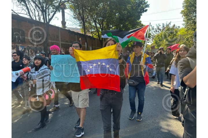 CIUDAD DE MÉXICO, 03ENERO2026.- Luego de manifestarse en la embajada de Estados Unidos, protestantes marcharon rumbo a la embajada de Venezuela en la Ciudsd de a México. El contingente cantó protestas contra la intervención estadounidense, pro palestina y por acceso a una vivienda digna. FOTO: GUSTAVO ALBERTO/CUARTOSCURO.COM