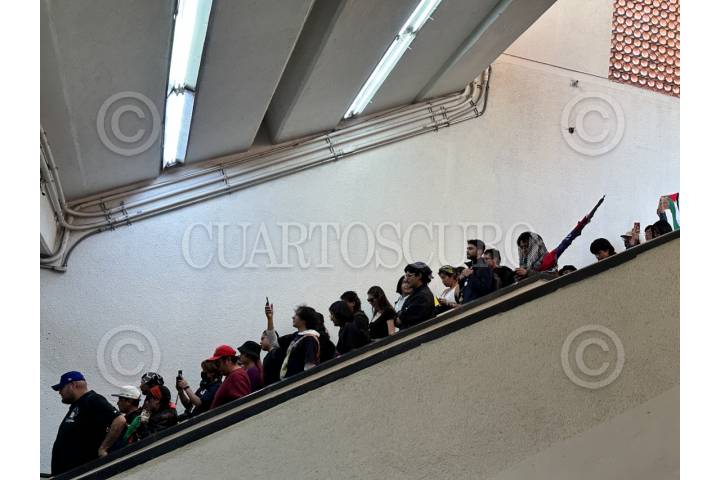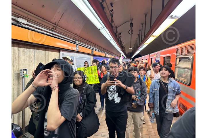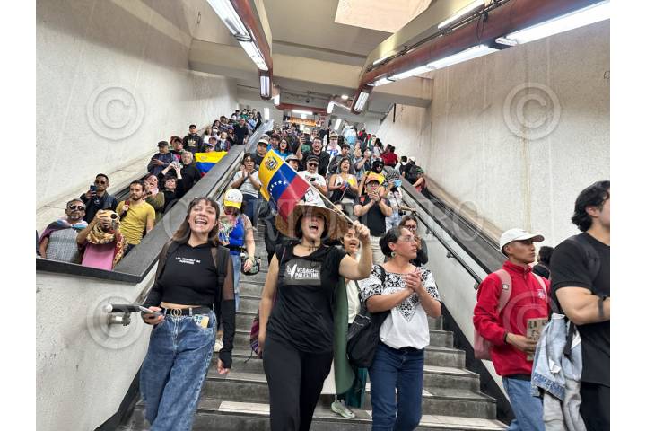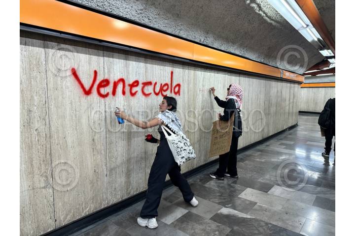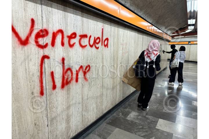 CIUDAD DE MÉXICO, 03ENERO2026.- Manifestantes a favor de Venezuela entraron al Metro de la Ciudad de México para ir de la estación San Joaquín rumbo a Polanco para continuar en su protesta en contra de la intervención de Estados Unidos en América Latina. Realizaron pintas y saltaron los torniquetes de la entrada . FOTO: GUSTAVO ALBERTO/CUARTOSCURO.COM