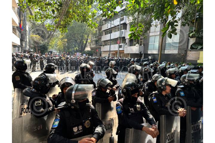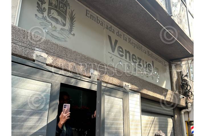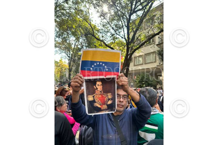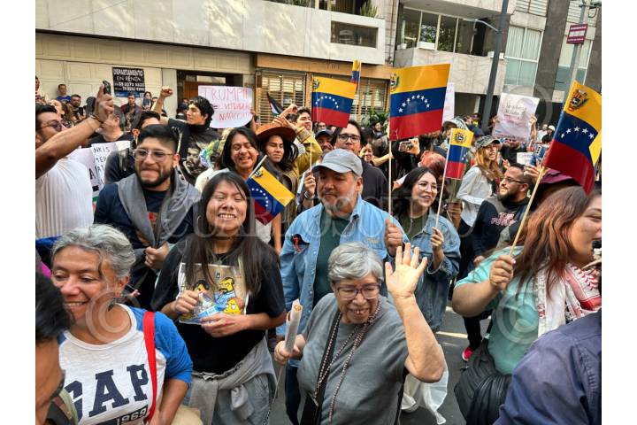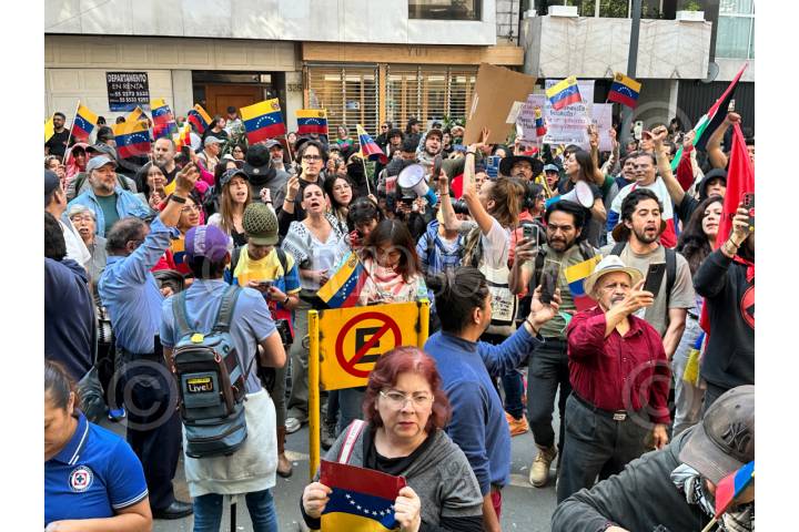 CIUDAD DE MÉXICO, 03ENERO2026.- Manifestación en la embajada de Venezuela en la Ciudad de México luego de que se informara que el presidente de Venezuela, Nicolás Maduro, fuera detenido por un golpe militar ordenado por el presidente estadounidense Donald Trump. FOTO: GUSTAVO ALBERTO/CUARTOSCURO.COM