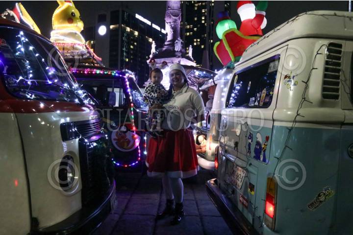 CIUDAD DE MÉXICO, 07DICIEMBRE2025.- Una madre acompañada de su bebé posaron para una foto durante la Caravana de Combis Navideñas en Avenida Paseo de la Reforma. FOTO: GRACIELA LÓPEZ/CUARTOSCURO.COM