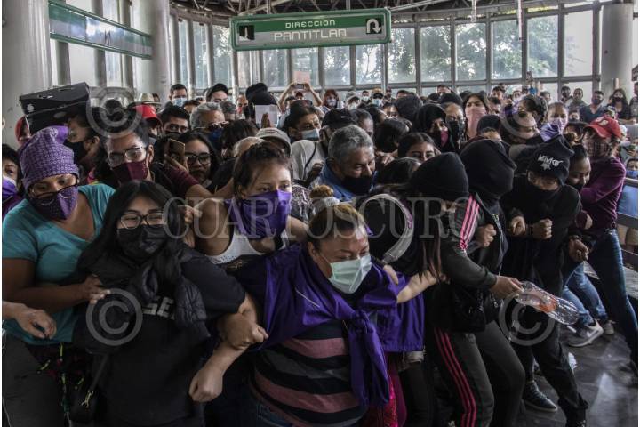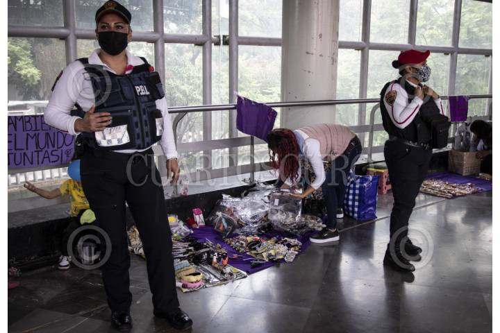 CIUDAD DE MÉXICO, 26ENERO2026.- Archivo de julio de 2021, durante la primera protesta en la que se decidió fundar Leonas Vagoneras. Patricia, de 56 años, fundó la colectiva en 2021 siguiendo el ejemplo de las protestas feministas —el nombre fue elegido por votación, al considerarse mujeres que se acompañan en manada—. La colectiva, integrada únicamente por mujeres, llegó a reunir hasta 130 vendedoras informales del Metro y ha logrado establecer alianzas con organizaciones como la asociación Fondo de Semillas, lo que les ha permitido contar con abogadas, apoyo psicológico, orientación ante detenciones y separación de sus hijos, talleres gratuitos para la independencia económica y el acceso a 10 locales para la colectiva como alternativa a la informalidad. FOTO: ANDREA MURCIA /CUARTOSCURO.COM