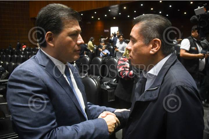 CIUDAD DE MÉXICO, 21ABRIL2026.- Víctor Hugo Lobo Román, diputado de Morena saluda a Carlos Puente, diputado y coordinador del PVEM, previo al inicio de la sesión de la Cámara de Diputados en la que se discute el dictamen de la Comisión de Puntos Constitucionales por el que se reforma el artículo 73 en materia de feminicidio. FOTO: MARIO JASSO/CUARTOSCURO.COM