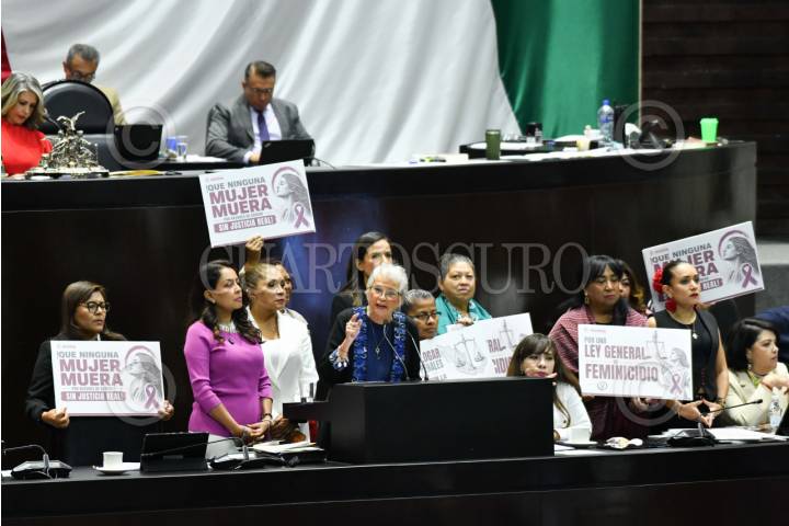 CIUDAD DE MÉXICO, 21ABRIL2026.- Olga Sánchez Cordero, diputada del Morena junto a su compañeras de bancada, durante su participación en la sesión de la Cámara de Diputados en la que se discutió el dictamen de la Comisión de Puntos Constitucionales por el que se reforma el artículo 73 en materia de feminicidio. FOTO: MARIO JASSO/CUARTOSCURO.COM