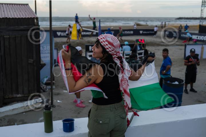 BOCA DEL RÍO, VERACRUZ, 02OCTUBRE2025.- Manifestantes pro palestinos irrumpieron en el Mundial de Voleibol de Playa 2025 y obligaron a suspender el partido entre Italia e Israel. Los jugadores israelíes Eylon Elazar y Kevin Cuzmiciov tuvieron que abandonar la cancha mientras los manifestantes lanzaban consignas y mostraban banderas y carteles en protesta contra la ofensiva militar en Gaza. FOTO: FÉLIX MÁRQUEZ/CUARTOSCURO.COM