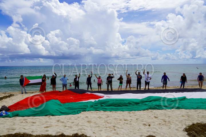 CANCÚN, QUINTANA ROO, 05OCTUBRE2025.- Un grupo de activistas se manifestaron en apoyo a de Palestina, en la emblemática Playa Delfines, ahí formaron las palabras “genocidio en Palestina” con sargazo recolectado en la playa. FOTO: ELIZABETH RUIZ/CUARTOSCURO.COM