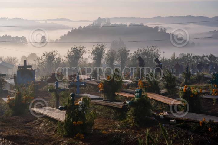 SAN ISIDRO BUENSUCESO, TLAXCALA, 02NOVIEMBRE2025.- En la madrugada de este Día de Muertos los habitantes de San Isidro Buensuceso se reunieron en el nuevo panteón de la comunidad para "alumbrar" el camino de sus seres queridos que han partido al más allá. Con velas, flores, comida y música los pobladores acompañaron a sus fieles difuntos en su camino de regreso a este plano terrenal. FOTO: ALAÍN HERNÁNDEZ/CUARTOSCURO.COM