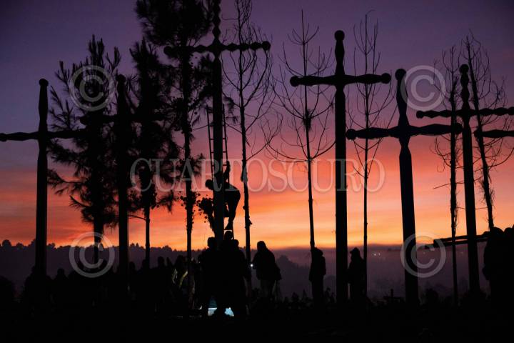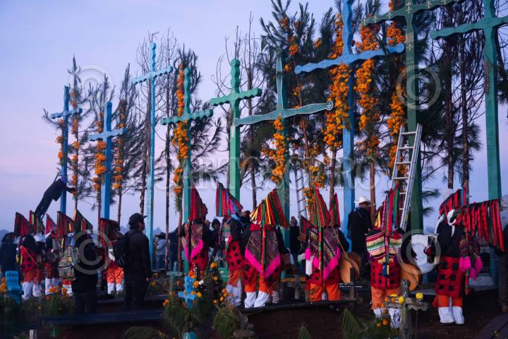 ROMERILLO, SAN CRISTÓBAL DE LAS CASAS, CHIAPAS,01NOVIEMBRE2025.- Pobladores de diferentes parajes que rodean la comunidad acuden al panteón con la juncia y la flor de cempasúchil fresca, cargando los troncos desde muy temprano. La labor consiste en reemplazar los adornos secos de las cruces gigantes que se posan en la parte más alta, una acción clave dentro de la celebración del Día de Todos Santos. FOTO: ISABEL MATEOS HINOJOSA/CUARTOSCURO.COM