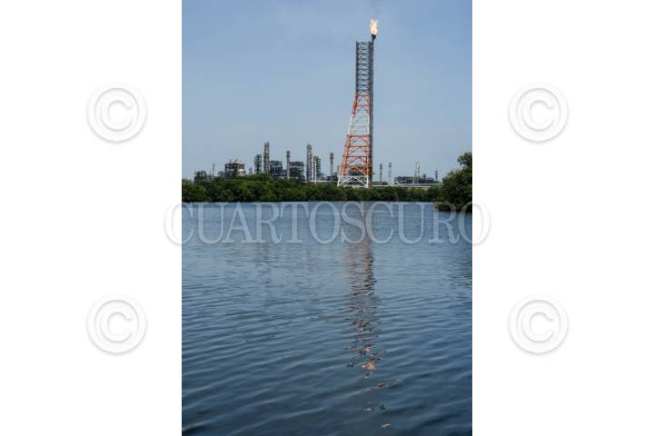 PARAISO, TABASCO, 17ABRIL2026.- Antorcha de seguridad (mechero) de la refinería Olmeca Dos Bocas. Esta estructura se utiliza para la combustión controlada de los excedentes de gases generados durante los procesos de refinación, vista desde el margen de el río Seco. FOTO: ISABEL MATEOS HINOJOSA /CUARTOSCURO.COM
