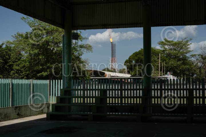 PARAISO, TABASCO, 17ABRIL2026.- Vista general de la Escuela Primaria Abías Domínguez Alejandro y su proximidad con la refinería Olmeca Dos Bocas. La comunidad escolar exige a los tres niveles de gobierno el traslado de la institución debido a los riesgos sanitarios y operativos derivados de la colindancia con el complejo petrolero. FOTO: ISABEL MATEOS HINOJOSA /CUARTOSCURO.COM