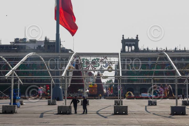 CIUDAD DE MÉXICO, 20DICIEMBRE2025.- Aspectos del montaje y los preparativos para el Festival de Luces de Invierno, que se llevará a cabo en el Zócalo capitalino durante las fechas navideñas. FOTO: CAMILA AYALA BENABIB / CUARTOSCURO.COM