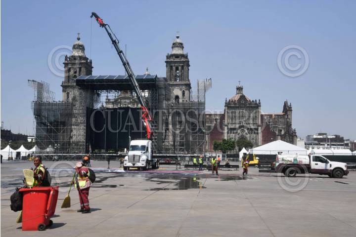 CIUDAD DE MÉXICO, 26FEBRERO2026.- Instalación del escenario y limpieza del zócalo capitalino para el concierto de la cantautora colombiana Shakira que se realizará el próximo domingo. FOTO: MARIO JASSO/CUARTOSCURO.COM