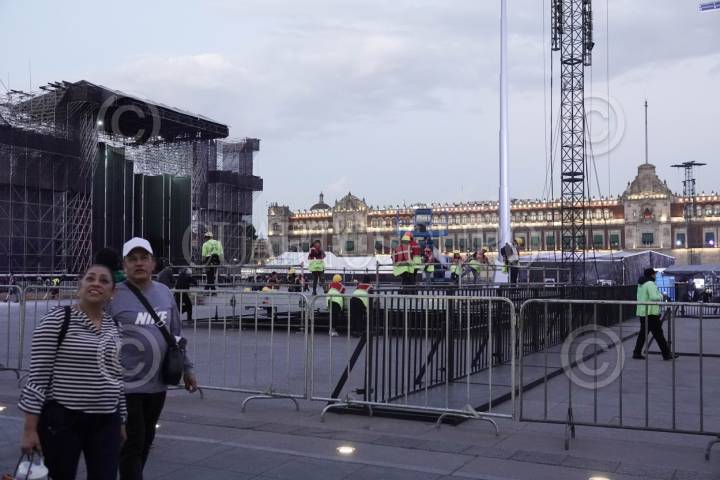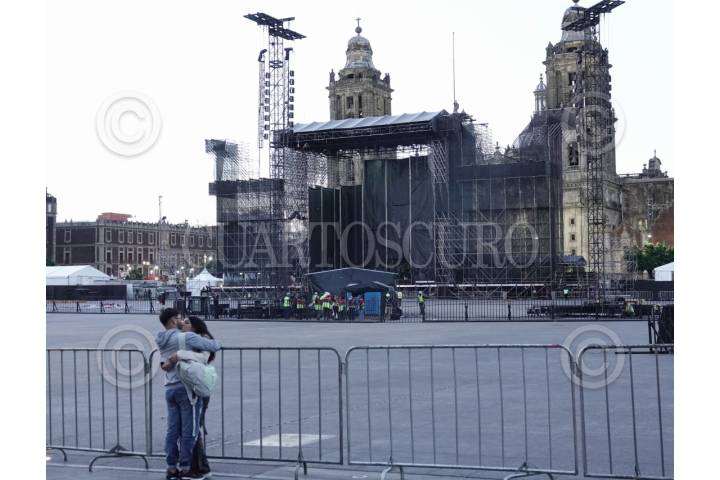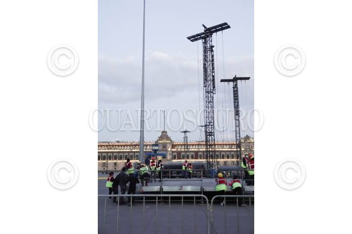 CIUDAD DE MÉXICO, 14ENERO2025.- Trabajadores comenzaron con la instalación del escenario en el zócalo capitalino para el concierto del cantautor Fito Páez que se presentará el próximo sábado. FOTO: MARIO JASSO/CUARTOSCURO.COM