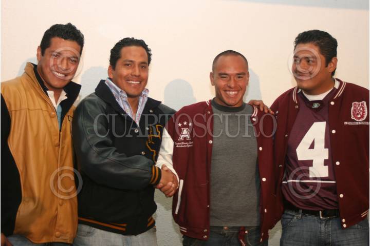 MÉXICO, D.F., 26NOVIEMBRE2008.- Miguel Angel Romero Capitan de los Pumas, Jose Luis Maza Matus Capiatan de la defensiva de las Aguilas Blancas y Alfredo Cae Herrera Capitán de la defensiva de Águilas Blancas, al termino de la conferencia donde durante la conferencia de prensa donde se dio a conocer que el partido de la final entre Pumas y IPN Se realiza el próximo sábado en el Estadio Olímpico de Ciudad Universitaria. FOTO: RICARDO CASTELAN/CUARTOSCURO.COM