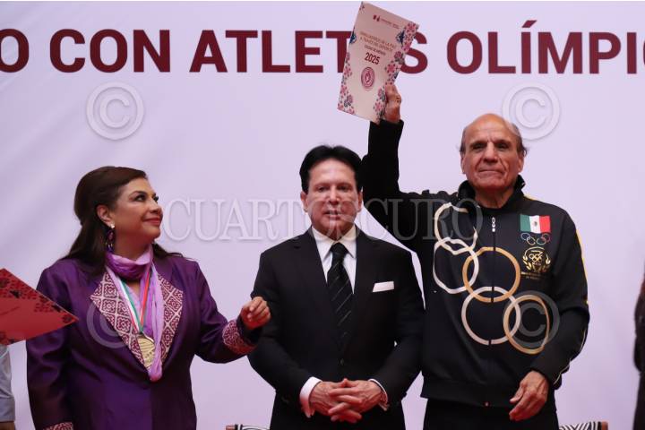 CIUDAD DE MÉXICO, 20OCTUBRE2025.- Clara Brugada, jefa de gobierno de la capital, entregó reconocimientos a distintos atletas que han representado a México en los juegos olímpicos desde las olimpiadas de México 68. FOTO: DANIEL AUGUSTO/ CUARTOSCURO.COM