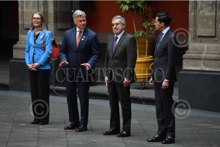 CIUDAD DE MÉXICO, 20ENERO2025.- Cameron MacKay, embajador de Canadá en México; Juan Ramón de la Fuente, secretario de Relaciones Exteriores y Roberto Velasco, subsecretario para América del Norte, durante la visita de Mary Simon, gobernadora general de Canadá y su esposo Whit Fraser a Palacio Nacional. FOTO: MARIO JASSO/CUARTOSCURO.COM