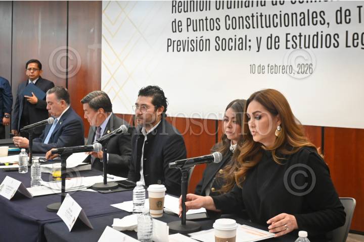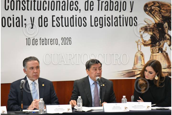 CIUDAD DE MÉXICO, 10FEBRERO2026.- Los legisladores Enrique Inzunza; Óscar Cantón Zetina y Geovanna Bañuelos, durante la reunión ordinaria de Comisiones Unidas de Puntos Constitucionales, de Trabajo y Previsión Social, y de Estudios Legislativos de la Cámara de Senadores en la que se aprobó la reforma a la Constitución para reducir la jornada laboral a 40 horas. FOTO: MARIO JASSO/CUARTOSCURO.COM