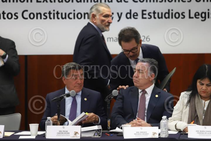CIUDAD DE MÉXICO, 24MARZO2026.- Las Comisiones Unidas de Puntos Constitucionales; y de Estudios Legislativos se reunió de manera extraordinaria para discutir el dictamen envíado desde la presidencia de la república en materia electoral (Plan B). En la imágen,los senadores de Morena, el presidente de la Comisión de Puntos Constitucionales, Óscar Cantón Zetina, dialoga con los senadores morenistas Adán Augusto López, Javier Corral e Ignacio Mier durante la discusión del Plan B en Comisiones. FOTO: DANIEL AUGUSTO/ CUARTOSCURO.COM