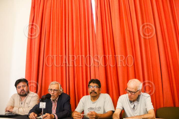 CIUDAD DE MÉXICO. 24SEPTIEMBRE2025.- Obed López, Humberto Martínez, José Cruz y Luis Vázquez en la conferencia de prensa de sindicatos universitarios por la migración. FOTO: VICTORIA VALTIERRA/CUARTOSCURO.COM