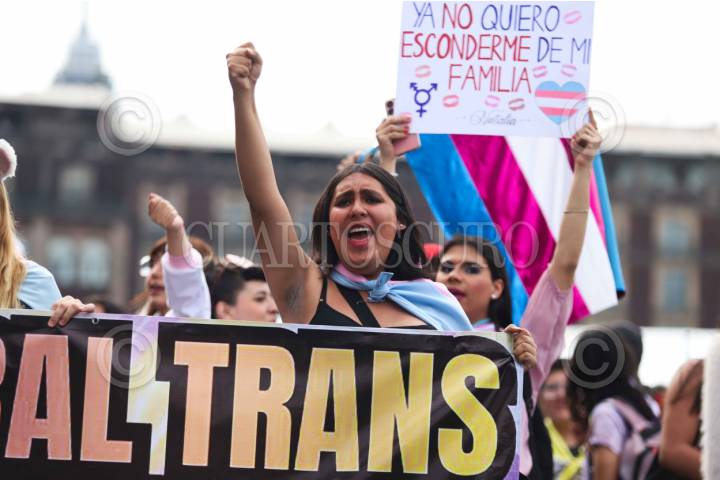 CIUDAD DE MÉXICO, 31MARZO2026.- En el marco del Día Internacional de la Visibilidad Trans, personas no binarie, mujeres y hombres trans exigieron justicia por empleo, salud y vivienda digna en una marcha que inicio en el Zócalo capitalino y finalizó en el metro chabacano de la Línea 2. FOTO: GRACIELA LÓPEZ/CUARTOSCURO.COM