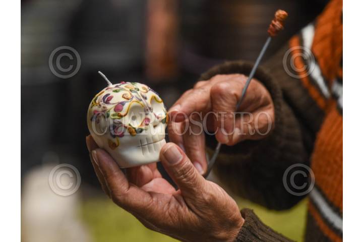 TENANGO DEL VALLE, ESTADO DE MÉXICO, 16OCTUBRE2025.- Marco Antonio Garduño, originario del municipio de Tenango del Valle y de oficio cerero, dentro del ramo artesanal, un oficio que aprendió de sus bisabuelos, abuelos y padres, ellos hacían el corte tradicional de las ceras, el cual también lo aprendió pero decidió hacer cosas diferentes, como velas con forma de frutas, árboles, aves, y para la celebración del Día de Muertos algunas velas con forma de pan de muerto, cráneos coloridos, implementando una técnica propia y original para moldear la cera y dar vida a todas estas figuras. Las ceras o velas son elementos importantes en el altar del Día de Muertos, ya que se considera que son la luz que sirve para iluminar su camino. Ceras Artesanales, como se conoce su emprendimiento, ha ganado varios concursos y sus productos han trascendido fronteras. Invita a la población a adquirir estos productos y que no se pierda la tradición de la cerería. FOTO: CRISANTA ESPINOSA AGUILAR.CUARTOSCURO.COM