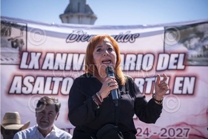 MADERA, CHIHUAHUA, 23SEPTIEMBRE2025.- La presidenta de la Comisión Nacional de los Derechos Humanos, Rosario Piedra Ibarra, participó en el evento de conmemoración por los sesenta años del Ataque al Cuartel Madera, realizado esta tarde en el municipio de Madera. FOTO: PEDRO ANZA /CUARTOSCURO.COM