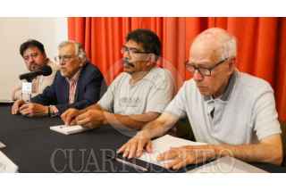 CIUDAD DE MÉXICO. 24SEPTIEMBRE2025.- Obed López, Humberto Martínez, José Cruz y Luis Vázquez en la conferencia de prensa de sindicatos universitarios por la migración. FOTO: VICTORIA VALTIERRA/CUARTOSCURO.COM