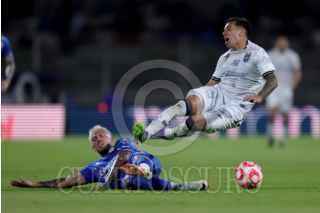 CIUDAD DE MÉXICO, 24SEPTIEMBRE2025. Gonzalo Piovi de La Máquina barre a Mateo Coronel de Los Gallos durante el partido de fútbol Cruz Azul vs Querétaro correspondiente a la jornada 10 del Torneo Apertura 2025 de Liga BBVA MX, en el Estadio Olímpico Universitario. FOTO: EDGAR NEGRETE LIRA/CUARTOSCURO.COM