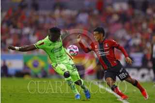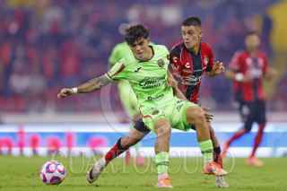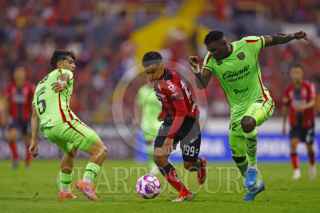 GUADALAJARA, JALISCO. 03SEPTIEMBRE2025- Sergio Hernández, jugador de Atlas, disputa el balón con los contrarios de Juárez, Jesús Murillo y Denzell García, esto en partido correspondiente a la jornada 12 del Torneo Apertura 2025 de la Liga MX, en donde se enfrentan los equipos de Atlas vs Juárez, en juego que se lleva a cabo en el Estadio Jalisco, el marcador al final es de 3-1. FOTO: FERNANDO CARRANZA GARCIA / CUARTOSCURO.COM