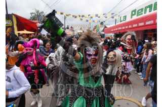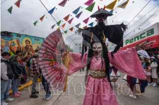 ALMOLOYA DE JUÁREZ, ESTADO DE MÉXICO, 05OCTUBRE2025.- Las calles de la comunidad de San Francisco Tlalcilalcalpan, en Almoloya de Juárez, se llenaron de música y color con el tradicional Paseo de los Pregoneros o Paseo de los Locos en honor a su santo patrón San Francisco de Asís, una tradición de muchos años en donde los participantes se disfrazan de monstruos, brujas y brujos, calaveras, payasos, personajes animados, entre otros. Las cuadrillas bailan durante el recorrido, algunos tractores adornados con flores e imágenes de San Francisco de Asís abren paso para esta festividad. FOTO: CRISANTA ESPINOSA AGUILAR/CUARTOSCURO.COM