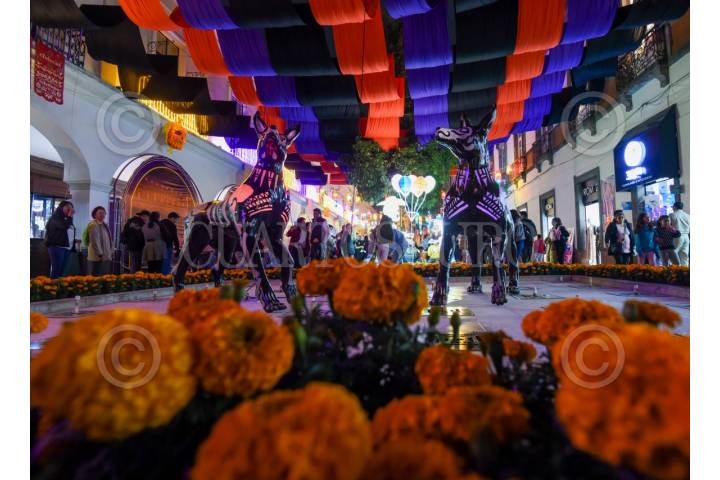 TOLUCA, ESTADO DE MÉXICO, 06OCTUBRE2025.- La temporada del Día de Muertos ha llegado a la ciudad de Toluca, en donde fueron instaladas figuras alusivas a esta época de las cuales disfrutan los visitantes a la Feria del Alfeñique, instaladas en el Andador Constitución, Plaza Fray Andrés de Castro y la Plaza Fray González Arratia, a la cual acuden cientos de familias para tomarse una fotografía de recuerdo. FOTO: CRISANTA ESPINOSA AGUILAR/CUARTOSCURO.COM