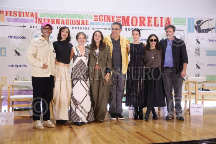 MORELIA, MICHOACÁN, 11OCTUBRE2025. Gerardo Gatica, Natalia Solián, Naian González Norvind, Cassandra Ciangherotti, Rodrigo García, Fernanda Castillo, Ilse Salas y Pablo Zimbrón durante la conferencia de prensa de la película "Las Locuras", como parte de las actividades del 23 Festival Internacional de Cine de Morelia. FOTO: EDGAR NEGRETE LIRA/CUARTOSCURO.COM