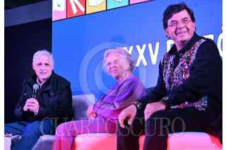 CIUDAD DE MÉXICO, 11OCTUBRE2025.- Jenaro Villamil, presidente del Sistema Público de Radiodifusión del Estado Mexicano (SPR), el caricaturista Rafael Barajas "El Fisgón"; la escritora Elena y Jesús Ramírez Cuevas, coordinador de Asesores de la Presidencia de la República, participaron en la la charla “Recordando a Monsiváis” durante las actividades de la Feria Internacional del Libro del Zócalo. FOTO: ALFREDO DÁVILA/CUARTOSCURO.COM